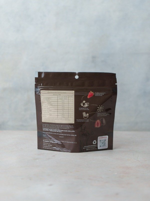 ¡Disfruta de nuestras Frutillas Liofilizadas bañadas en el mejor chocolate semi amargo! Para lograr el producto seleccionamos cuidadosamente las mejores frutillas liofilizadas 100% naturales y saludables, luego formamos las grajeas bañándolas una por una con chocolate semi amargo premium convirtiéndolas así en un snack crocante y delicioso ideal para acompañarte en cualquier momento del día.